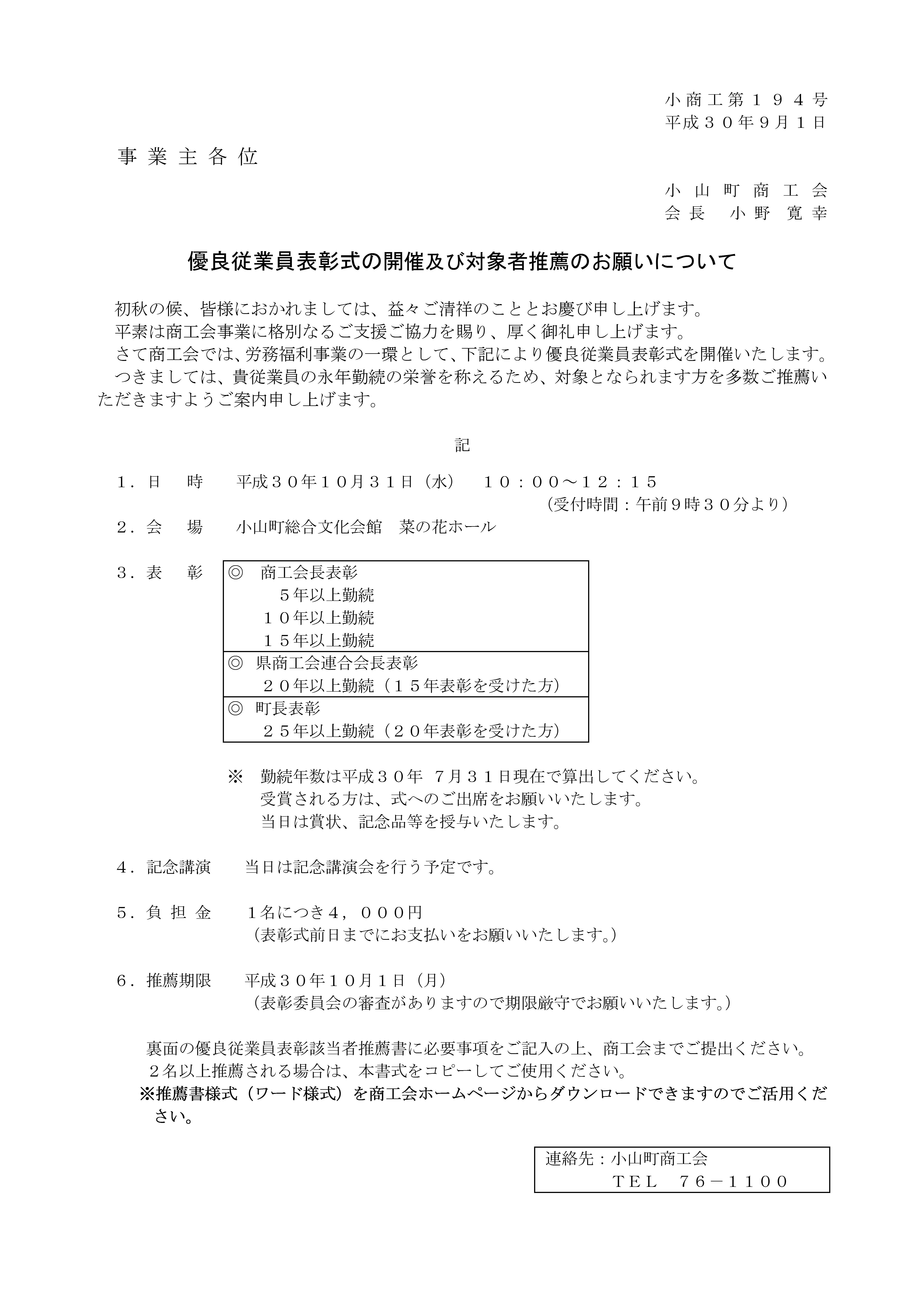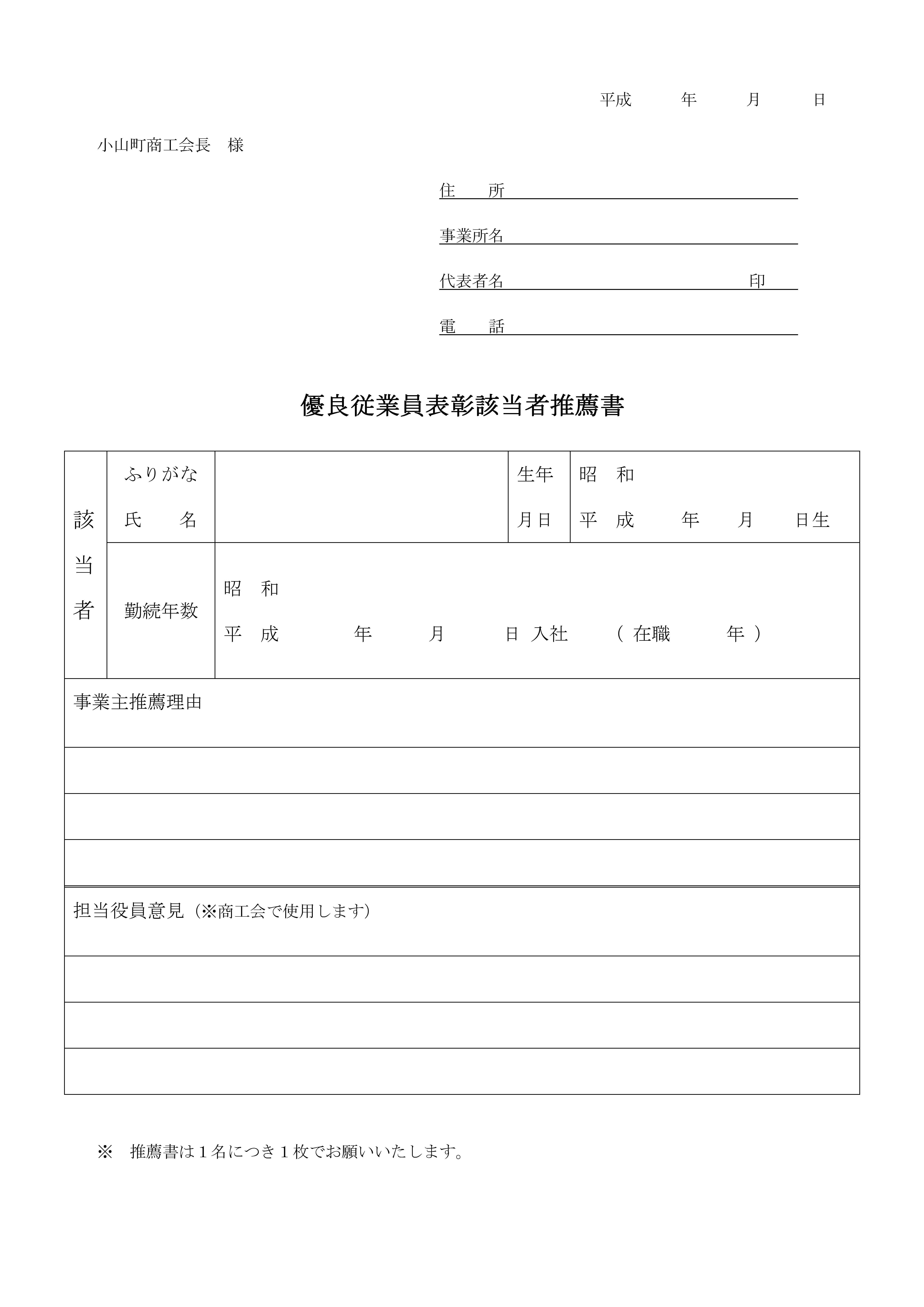 2018年9月3日 商工会からのお知らせ 優良従業員表彰式(推薦書様式)について 商工会では、労務福利事業の一環として、下記により優良従業員表彰式を開催します。 つきましては、貴従業員の永年勤続の栄誉を称えるため、対象となられます方を多数ご推薦いただきますようご案内いたします。 ■■■推薦書様式はこちらからダウンロードしてください■■■
