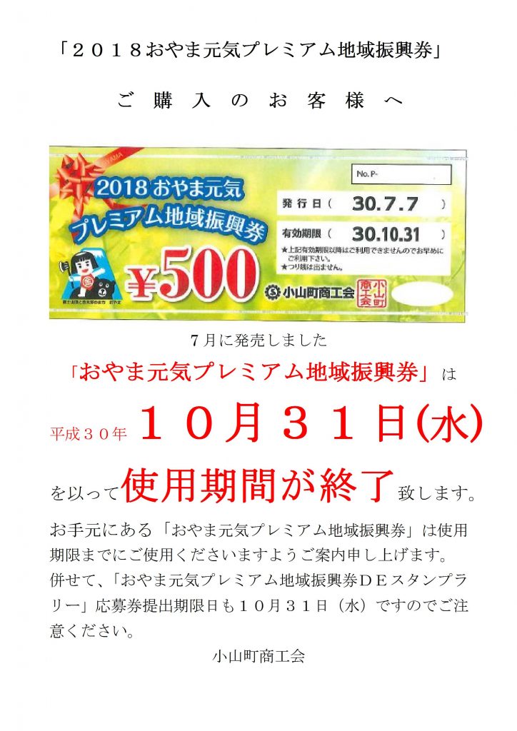 2018年10月19日 商工会からのお知らせ 「2018おやま元気プレミアム地域振興券」ご購入のお客様へ 7月に販売しました「おやま元気プレミアム地域振興券」は 平成30年10月31日(水)を以って使用期限が終了いたします。 お手元にある「おやま元気プレミアム地域振興券」は 使用期限までにご使用くださいますようご案内申し上げます。 併せて、「おやま元気プレミアム地域振興券DEスタンプラリー」応募券提出期日も 10月31日(水)ですので、ご注意ください。