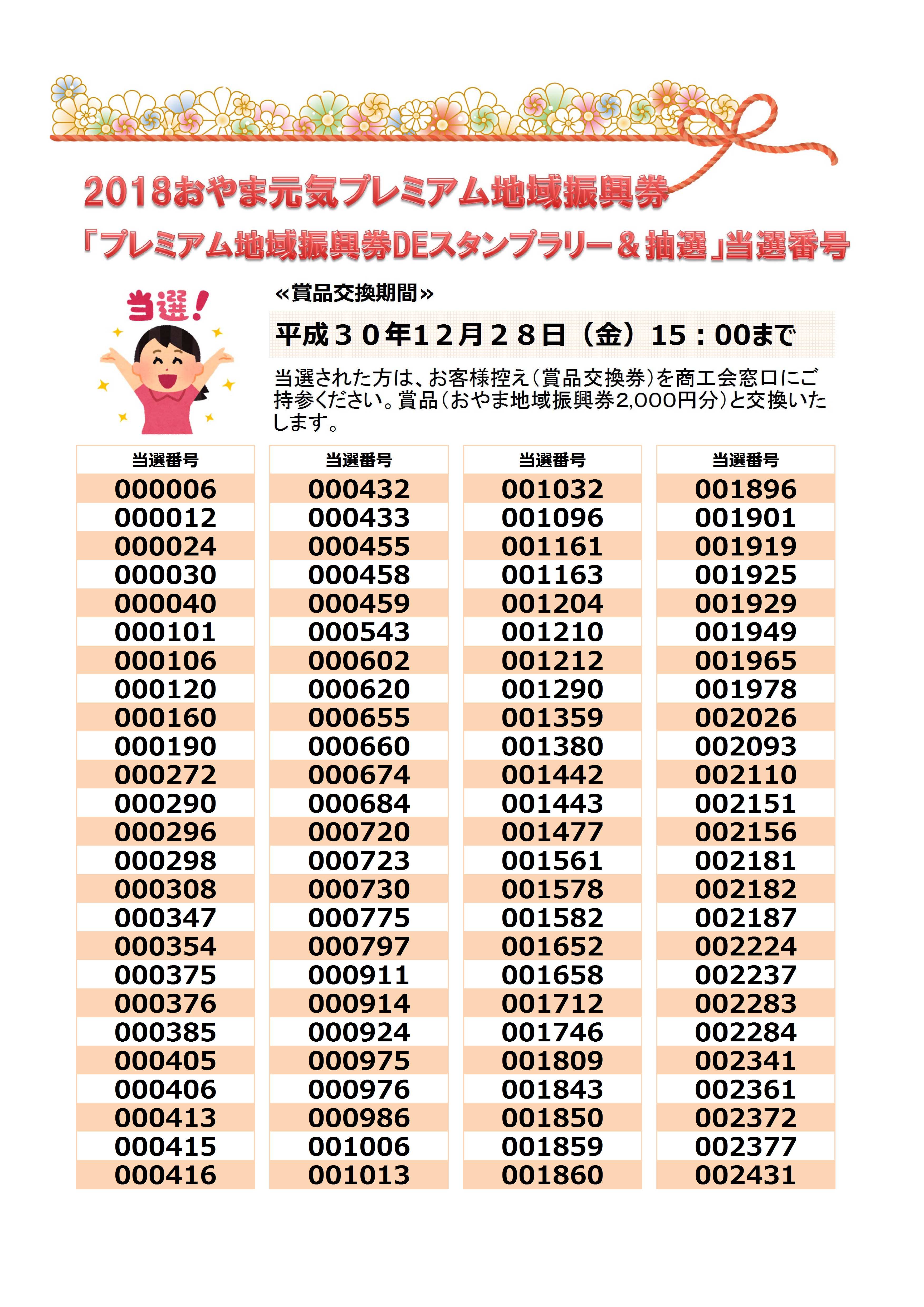 2018年12月10日 お知らせからのお知らせ プレミアム地域振興券DEスタンプラリー当選番号の発表 プレミアム地域振興券DEスタンプラリー&抽選の当選番号を発表します。 当選された方は平成30年12月28日(金)までに お客様控を商工会窓口にお持ちください。 賞品(おやま地域振興券2,000円分)と交換いたします。 当選された皆さま、おめでとうございます!! こちらからもご覧いただけます 当選番号一覧