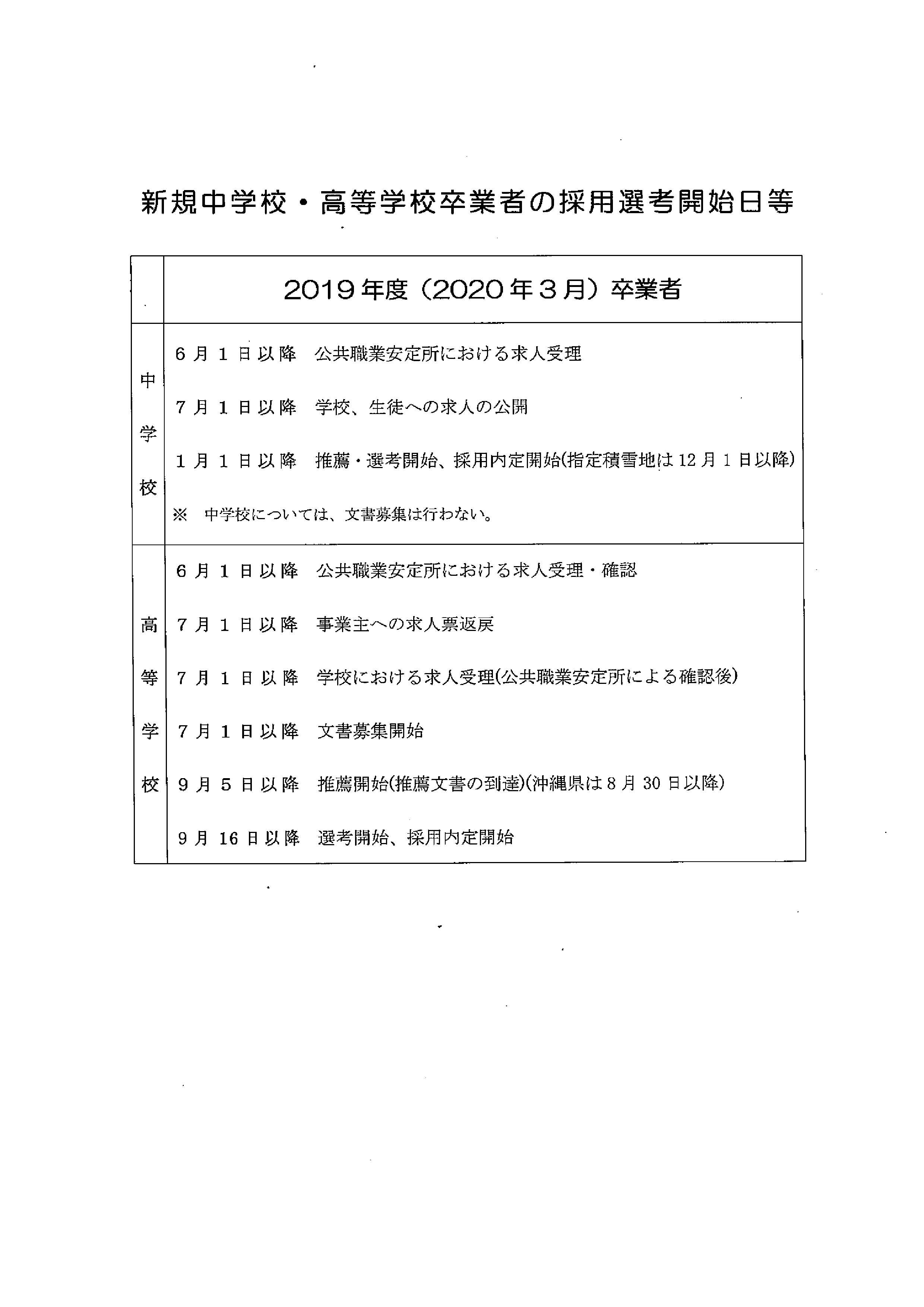 2019年3月18日 商工会からのお知らせ 静岡労働局からのお知らせ 静岡労働局より2020年3月新規中学校・高等学校卒業者の就職に係る推薦及び選考開始期日等並びに文書募集開始時期等についてお知らせします。選考開始時期等及び文書募集開始時期等の遵守についてご協力をお願いいたします。