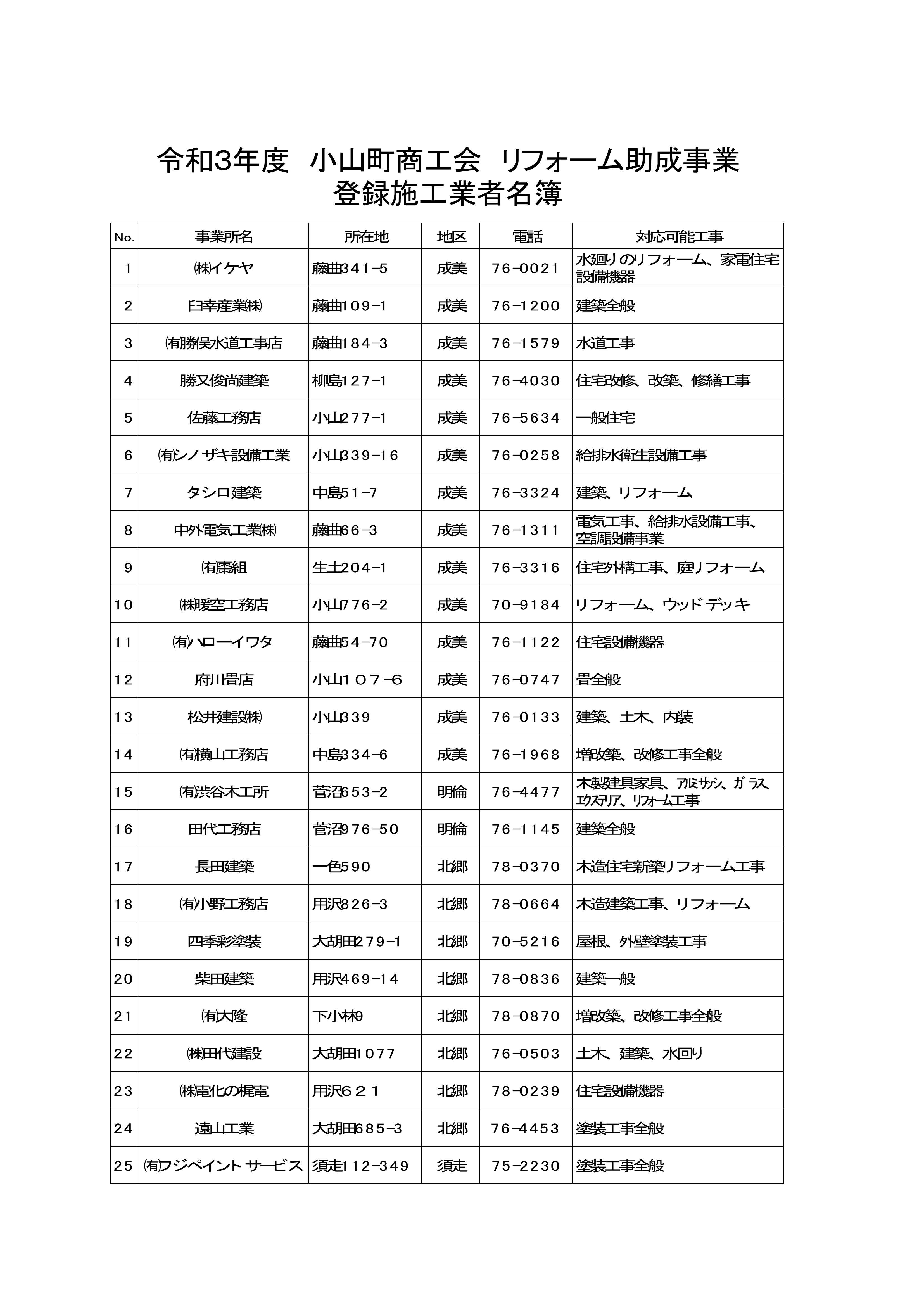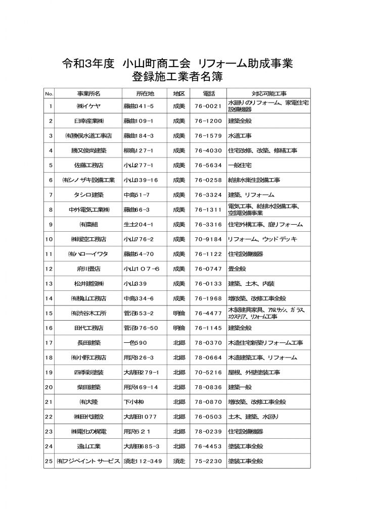 【PDF:52KB】令和3年度リフォーム助成事業 チラシ(事業者一覧)