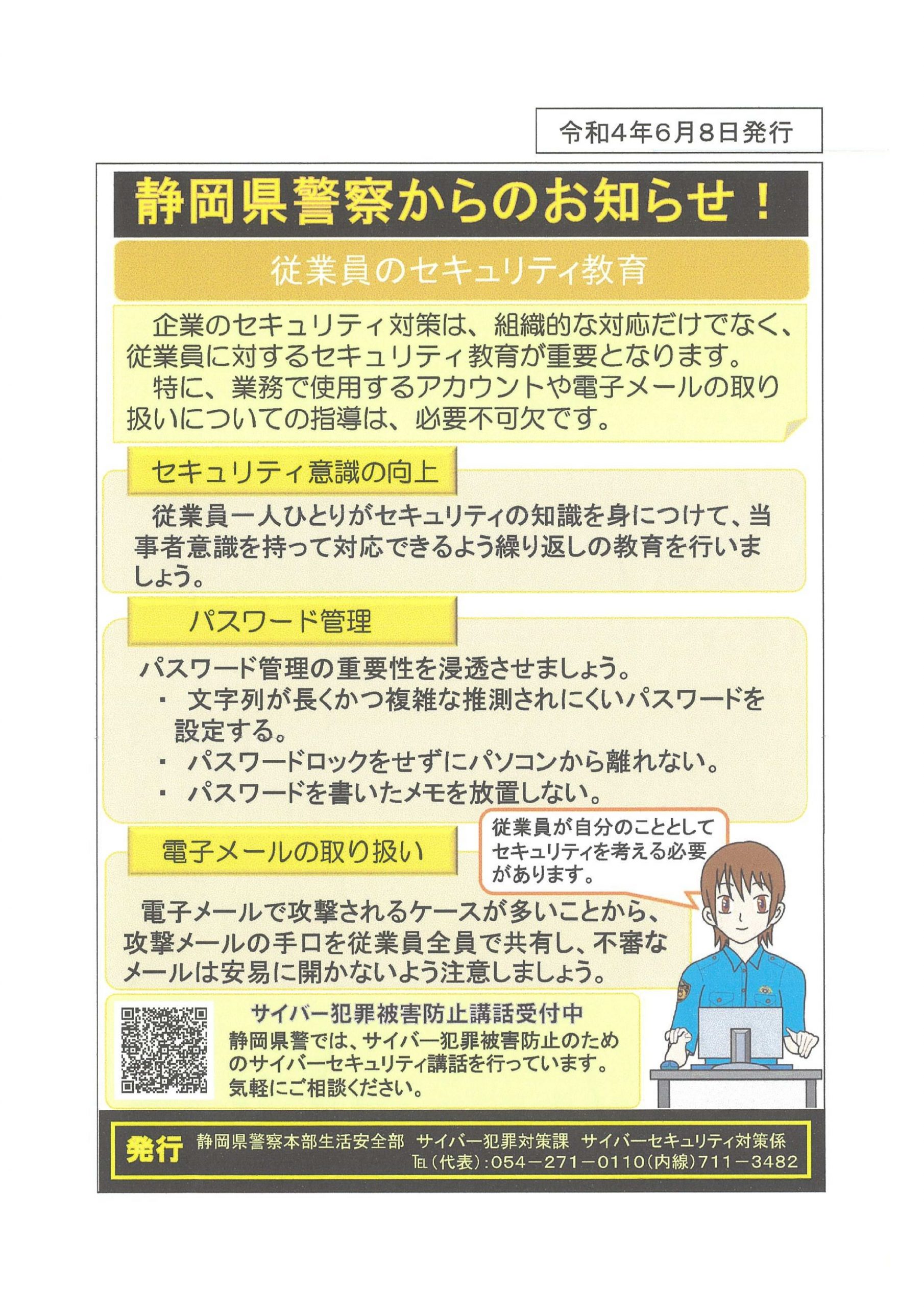 2022年6月20日 お知らせからのお知らせ 【ご案内】情報セキュリティチラシ(従業員のセキュリティ教育) 標記の件について、静岡県サイバー犯罪対策課より周知依頼がありましたので お知らせします。つきましては、添付ファイルをご覧いただき会員事業者等へ周知 いただきますようお願いいたします。 静岡県警察からのお知らせ PDF