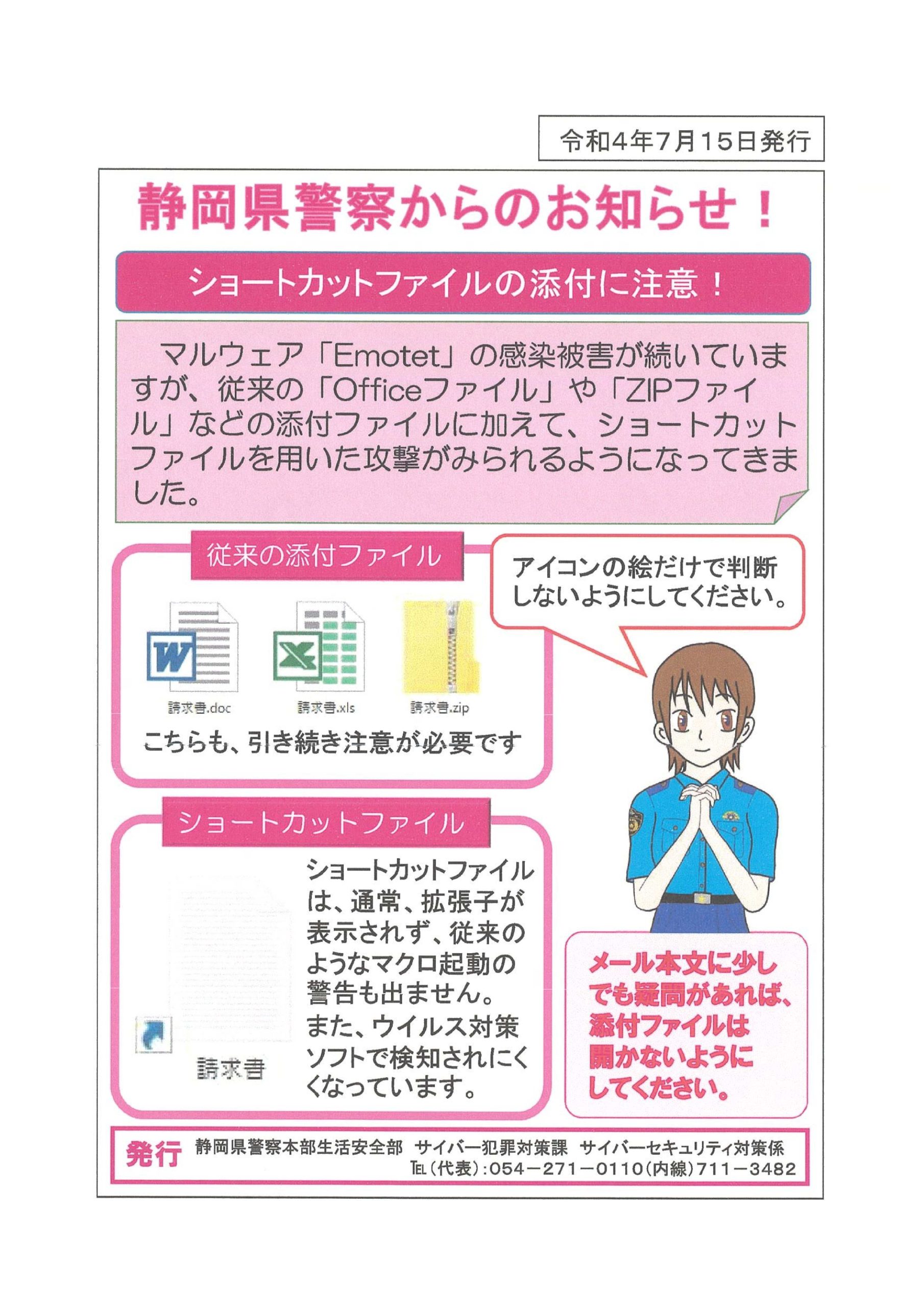 2022年7月21日 お知らせからのお知らせ 【ご案内】情報セキュリティチラシ(ショートカットファイルの添付に注意!)について 標記の件について、静岡県サイバー犯罪対策課より周知依頼がありましたので お知らせします。つきましては、添付ファイルをご覧いただきますようお願いいたします。 静岡県警察からのお知らせPDF