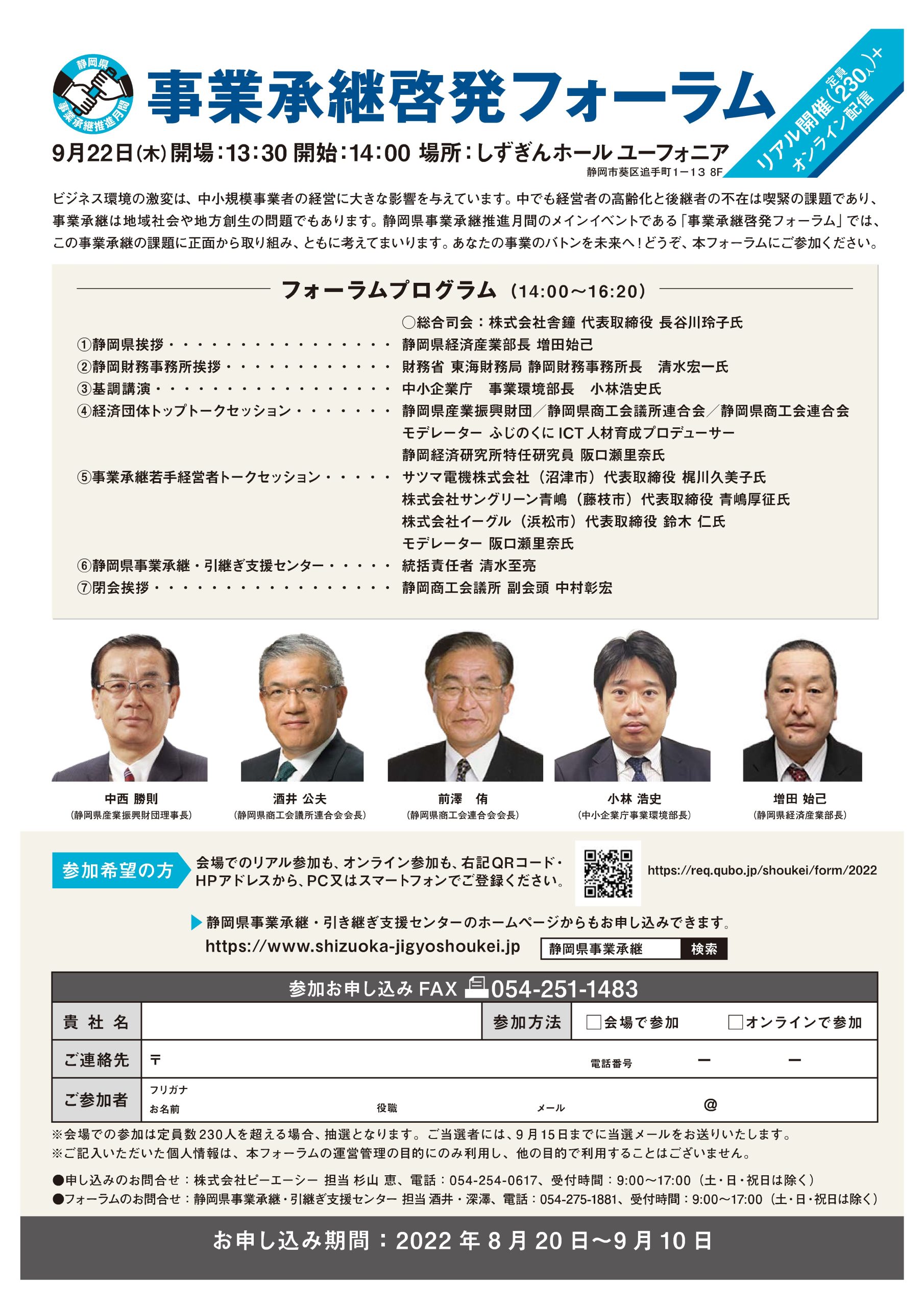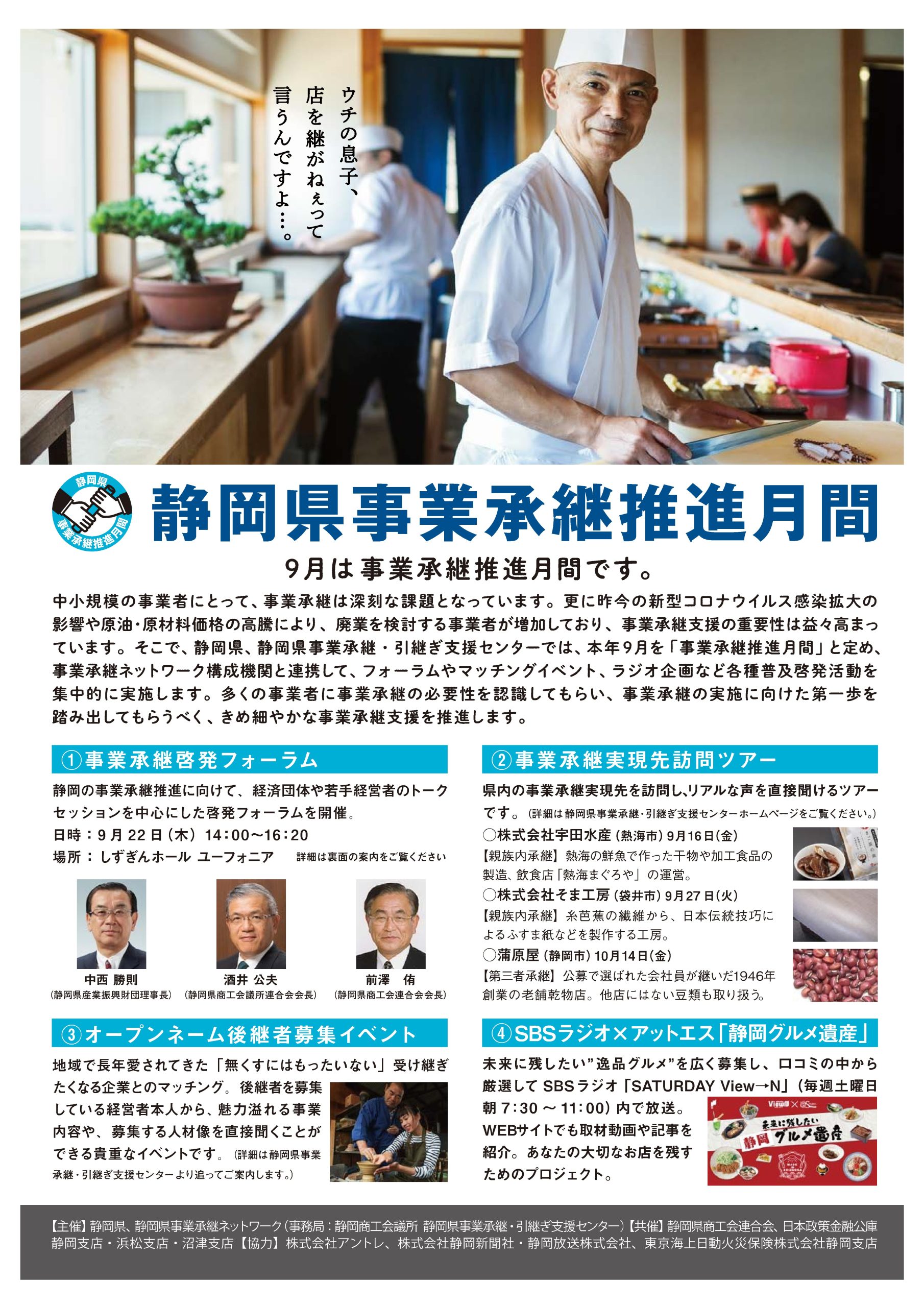 2022年8月24日 お知らせからのお知らせ 【ご案内】静岡県事業承継推進月間について 標記の件、静岡県及び事業承継・引継ぎ支援センターより、別添の通り周知依頼がありましたのでお知らせします。 静岡県事業承継推進月間チラシ.pdf (1.98MB)