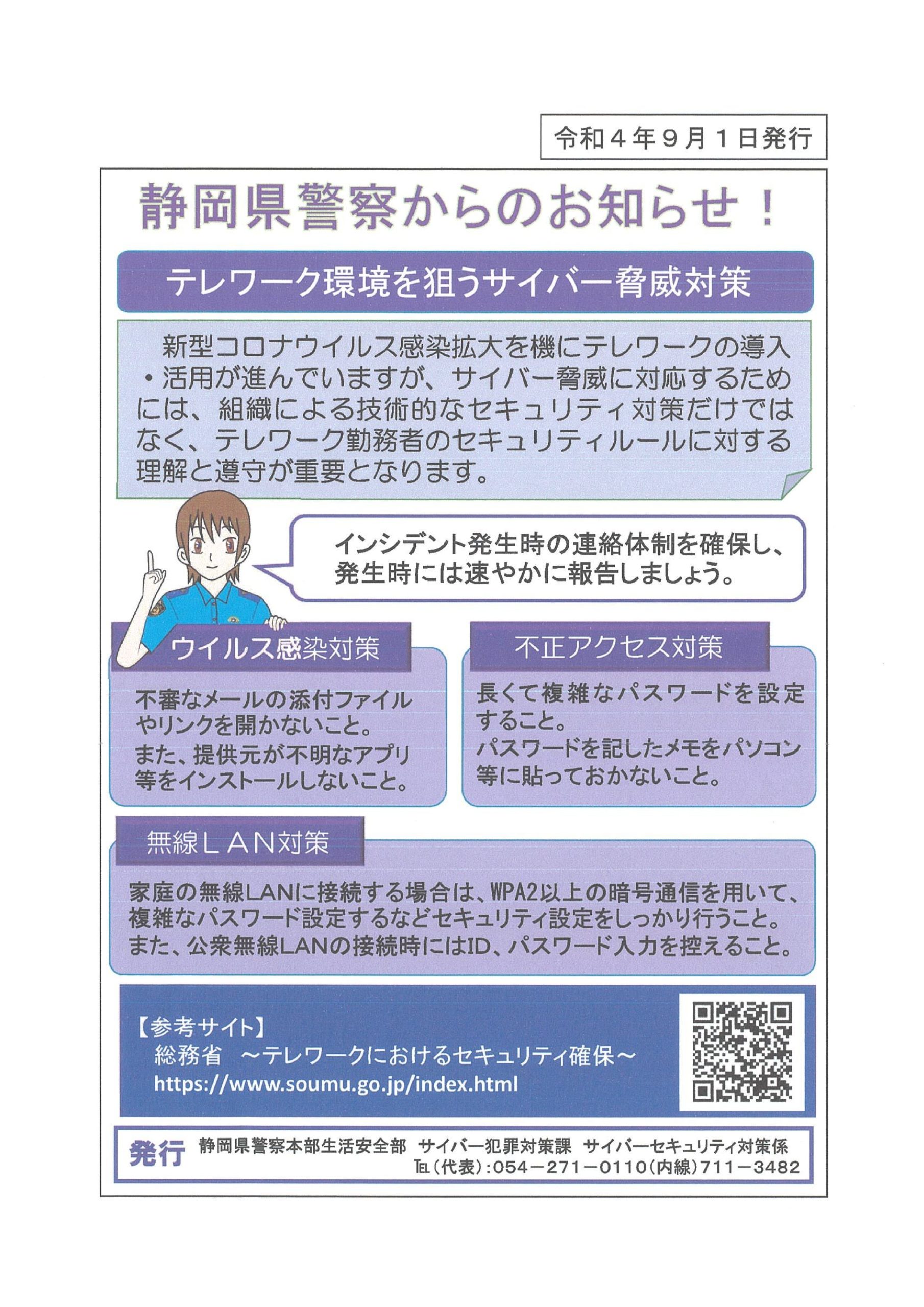 2022年9月7日 お知らせからのお知らせ 【周知依頼】情報セキュリティチラシ(テレワーク環境を狙うサイバー脅威対策)について 標記の件について、静岡県サイバー犯罪対策課より周知依頼がありましたのでお知らせします。 つきましては、添付ファイルをご覧いただき会員事業者等へ周知いただきますようお願いいたします。 静岡県警察からのお知らせ .pdf (0.56MB)