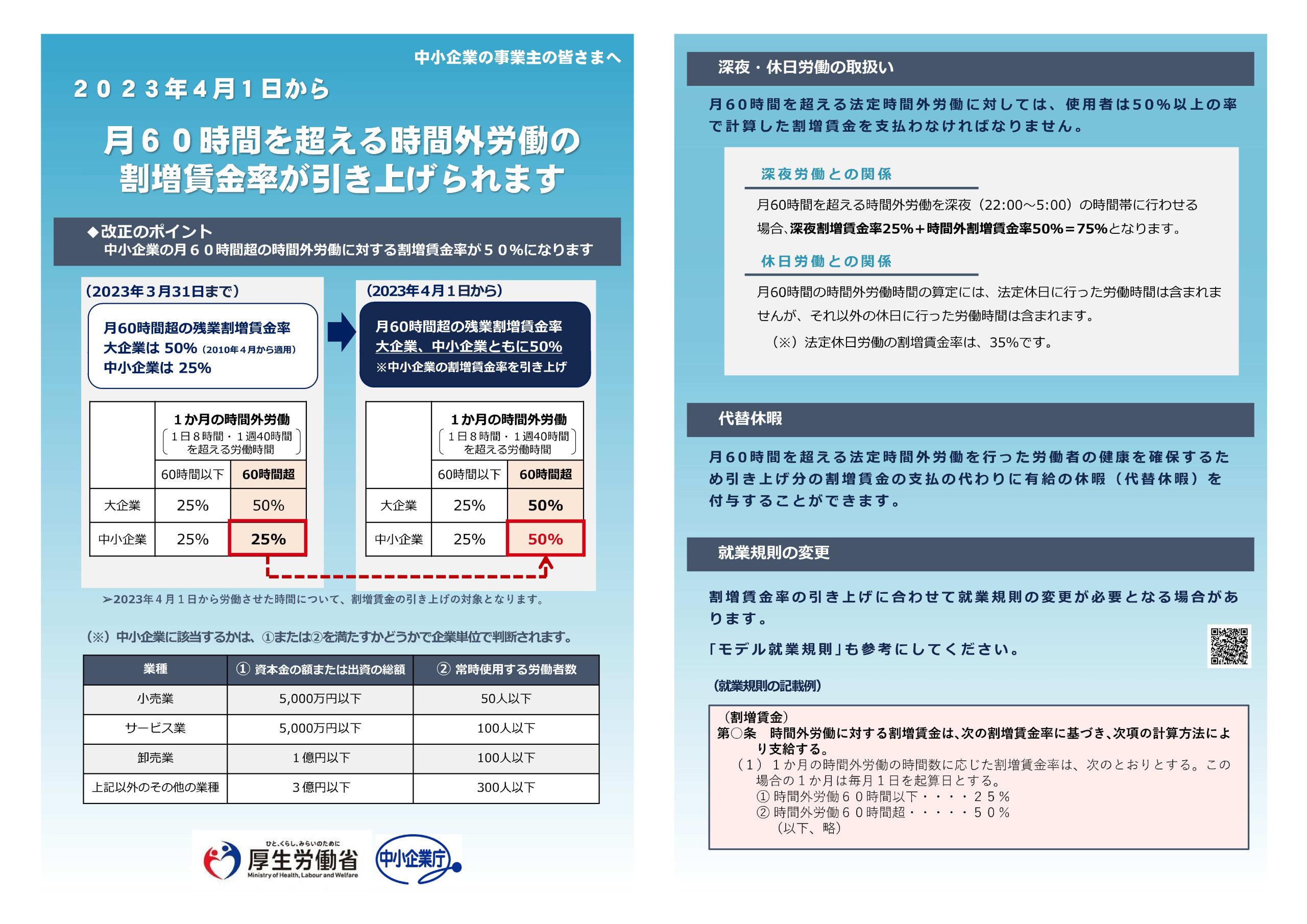 2022年10月7日 お知らせからのお知らせ 【お知らせ】中小・小規模事業主に対する割増賃金率の引上げについて 標記の件、厚生労働省より全国連経由で、働き方改革を推進するための関係法律の整備に関する法律による 改正後の労働基準法が施行されることによって、月60時間を超える時間外労働に係る割増賃金率の引上げが、 令和5年4月1日から適用される旨の周知依頼がありましたのでお知らせします。