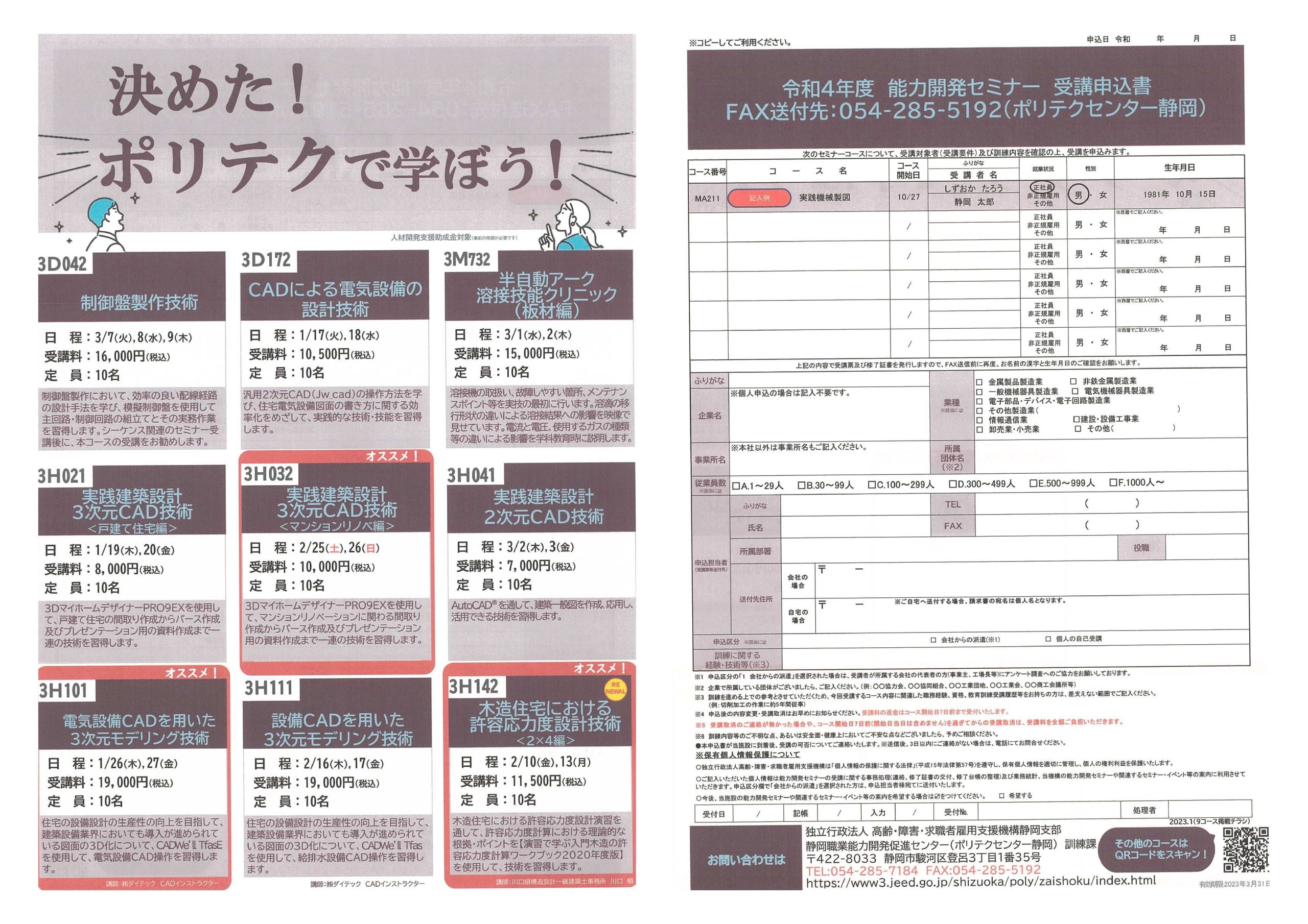 2022年12月12日 お知らせからのお知らせ 【お知らせ】能力開発セミナーのご案内 標記の件について、静岡職業能力開発促進センター(ポリテクセンター)より周知依頼がありましたのでご案内致します。 https://www3.jeed.go.jp/shizuoka/poly/zaishoku/index.html 【お申し込み・お問い合わせ】 (独)高齢・障害・求職者雇用支援機構静岡支部 静岡職業能力開発促進センター 所在地:静岡市駿河区登呂3-1-35 TEL:054-285-7184 FAX:054-285-5192
