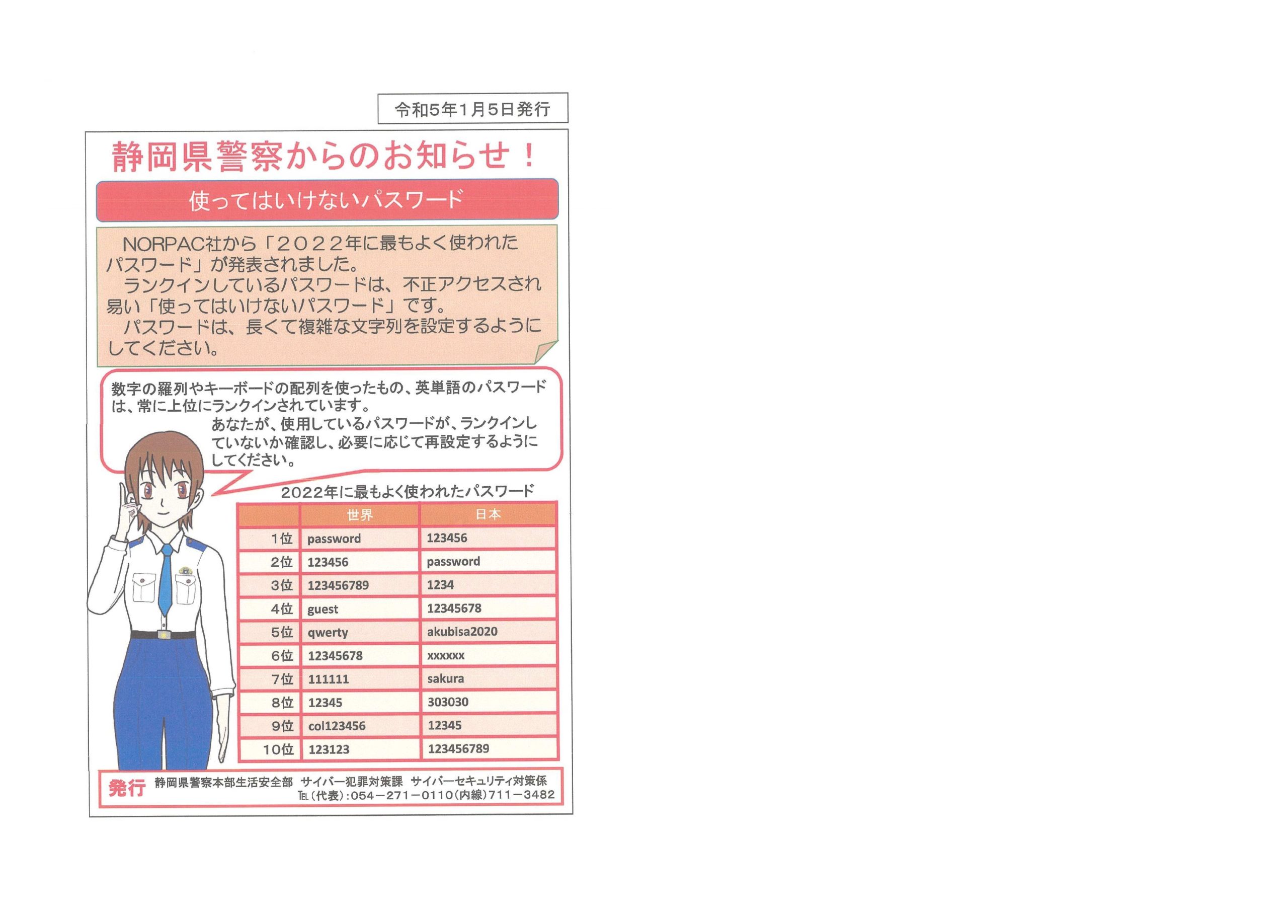 2023年1月10日 お知らせからのお知らせ 【お知らせ】情報セキュリティチラシ(使ってはいけないパスワード)について 標記の件について、静岡県サイバー犯罪対策課より周知依頼がありましたのでお知らせします。