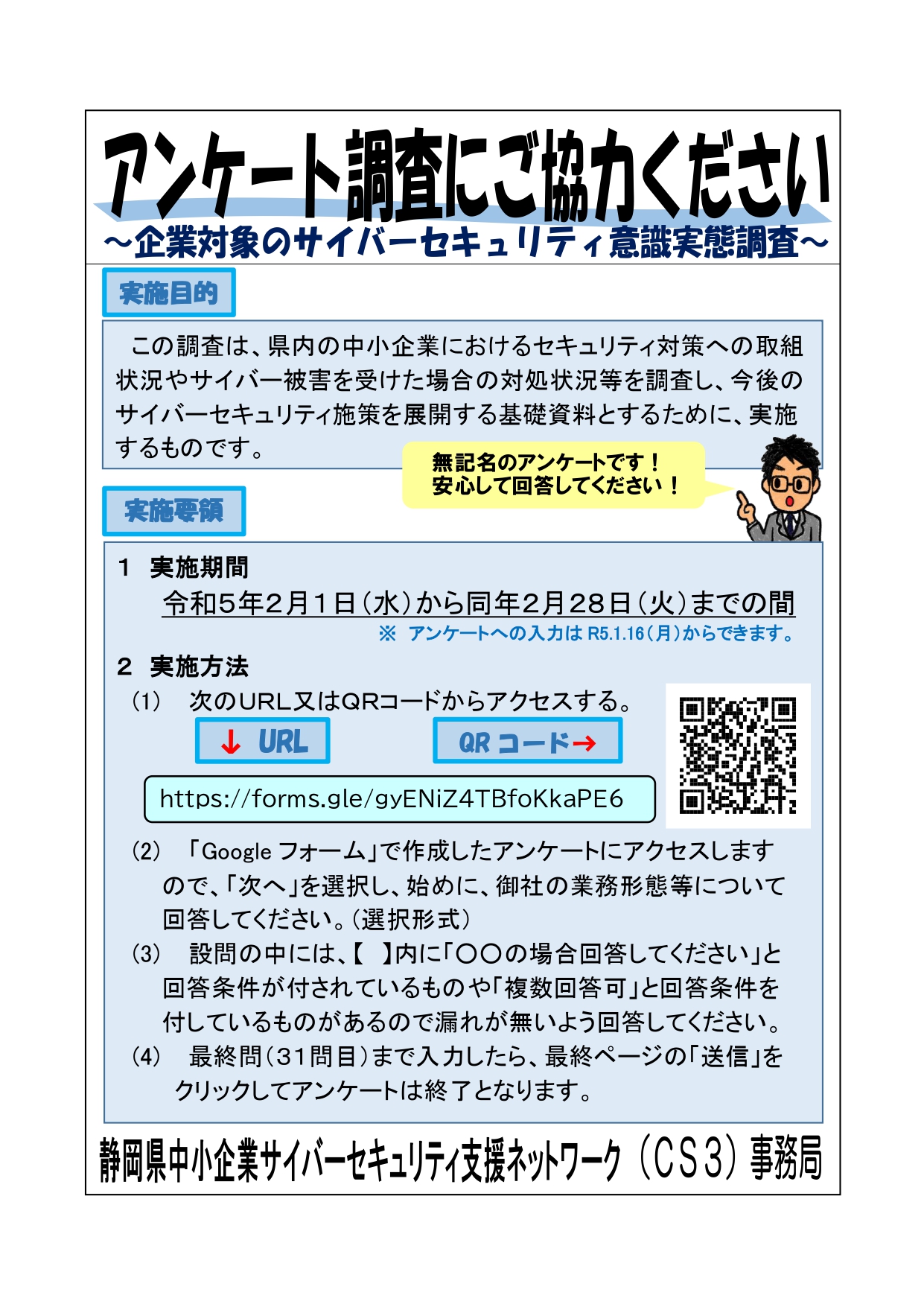 静岡県商工会連合会等が構成員となる「静岡県中小企業サイバーセキュリティ支援ネットワーク」(事務局:静岡県警察本部生活安全部サイバー犯罪対策課)では、添付のとおり県内中小企業におけるセキュリティ対策への取組状況について意識調査を実施します。