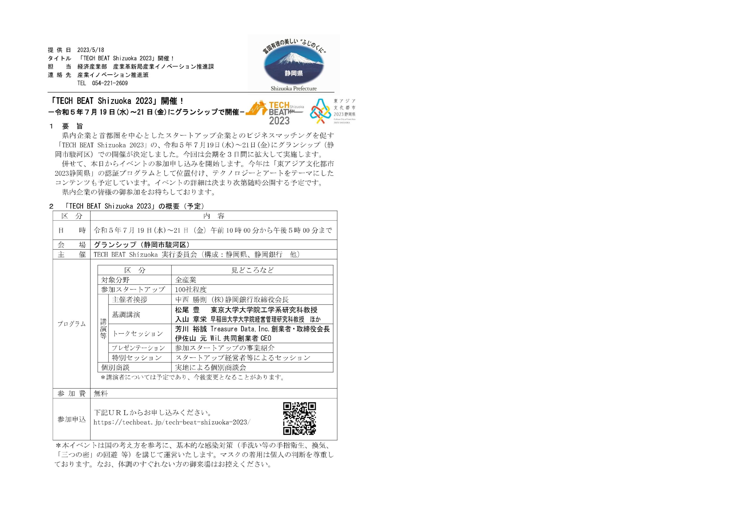 2023年5月24日 お知らせからのお知らせ 【お知らせ】TECH BEAT Shizuoka 2023の開催について 標記の件につきまして、静岡県産業イノベーション推進課よりプレスリリースの報告がありました。