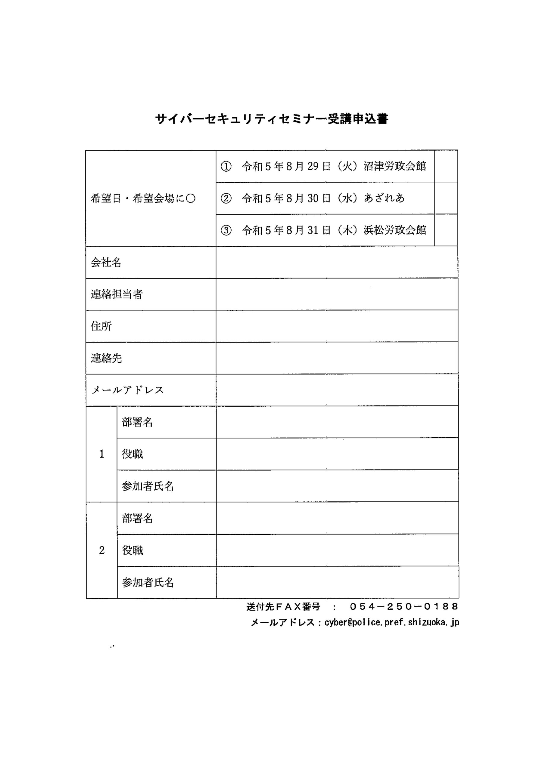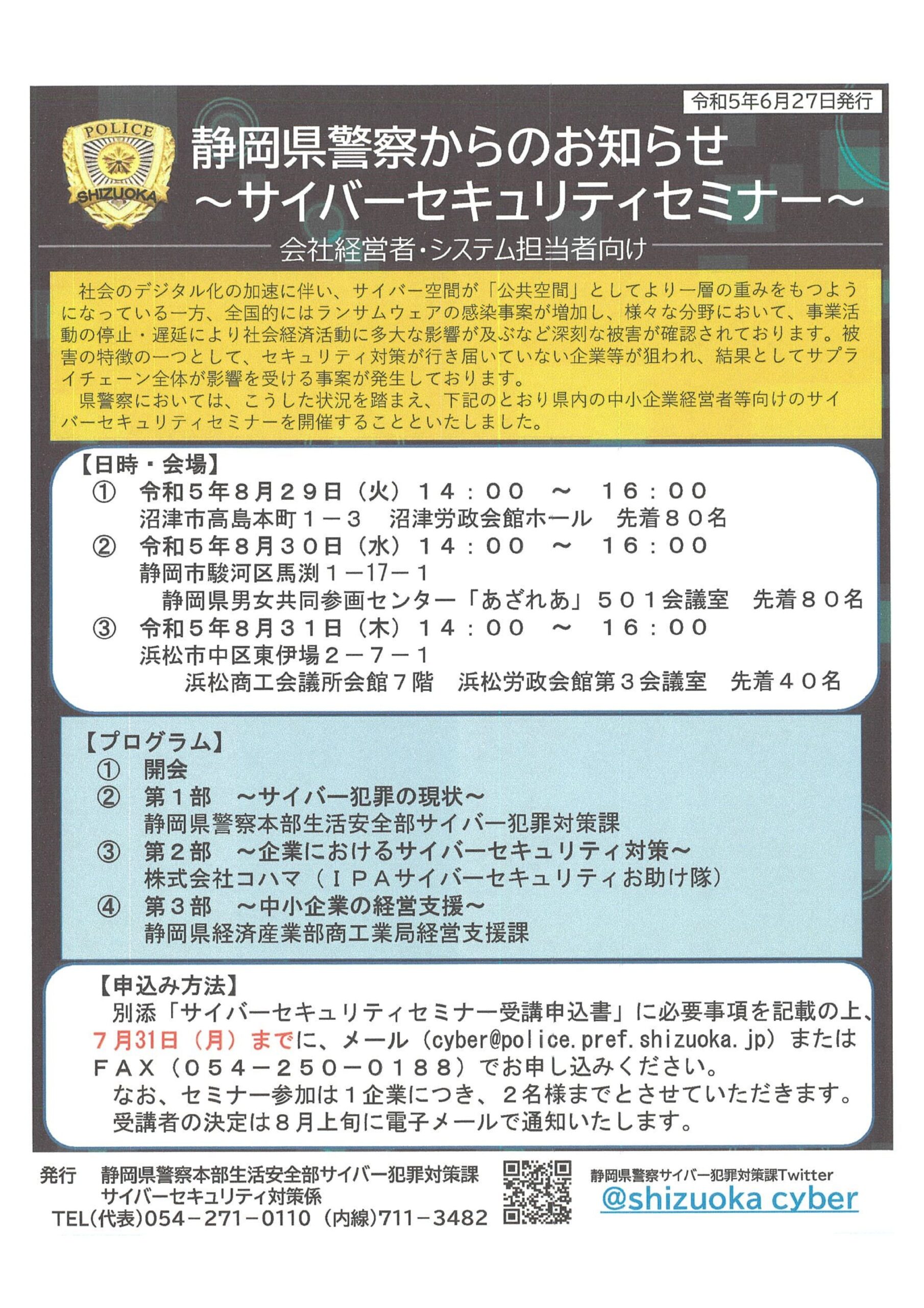 2023年6月28日 お知らせからのお知らせ 【ご案内】静岡県警察主催によるサイバーセキュリティセミナーについて 標記の件について、静岡県サイバー犯罪対策課より周知依頼がありましたのでお知らせします。お申込みを希望される場合は、サイバー犯罪対策課に直接お申込みください。受講者の決定は、8月上旬に、電子メールにて連絡がありますので、よろしくお願いいたします。 なお、各会場共通ですが、駐車場に限りがございますので、公共交通機関のご利用をお願いいたします。 詳細につきましては、添付チラシをご確認いただきますようお願いいたします。