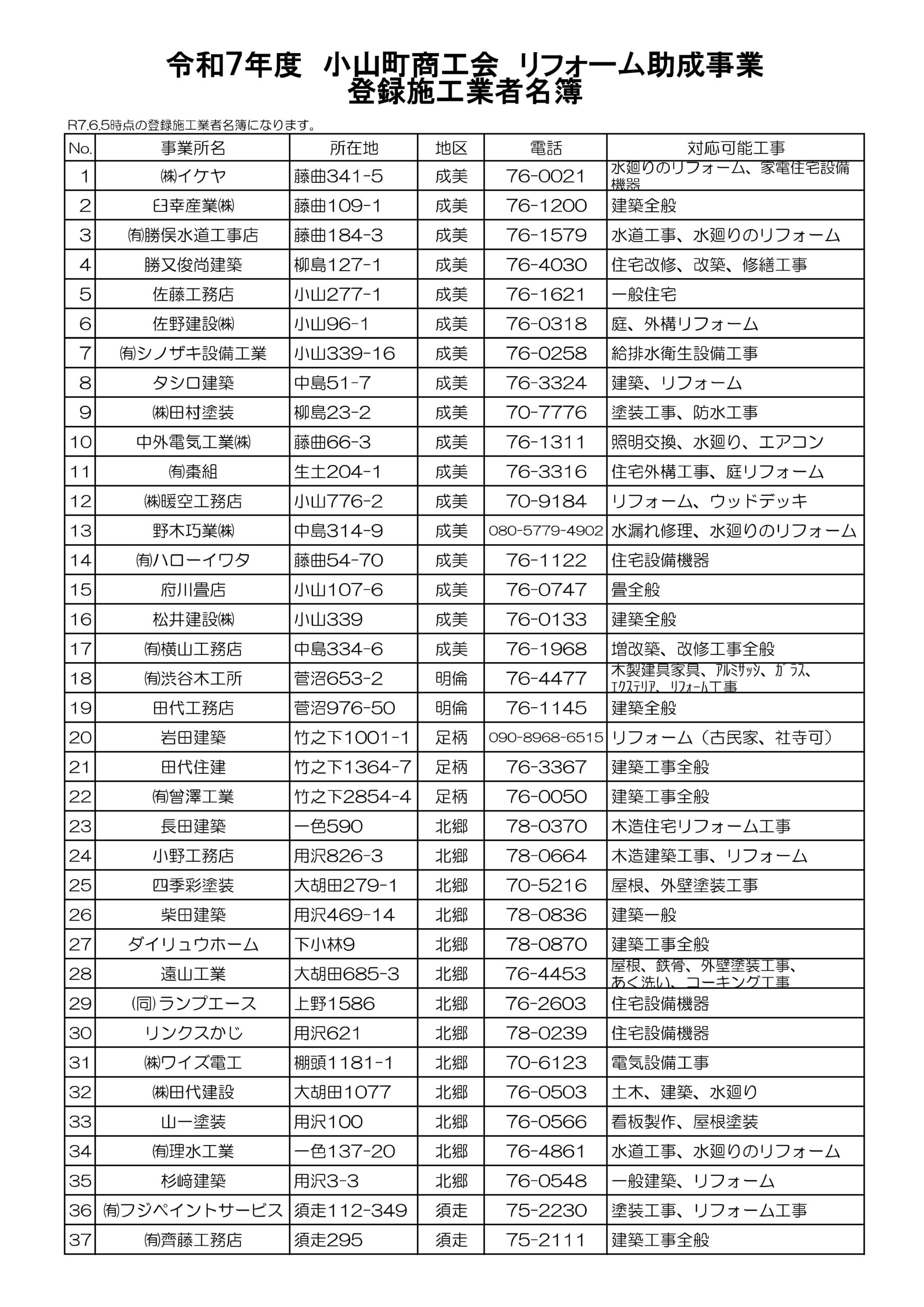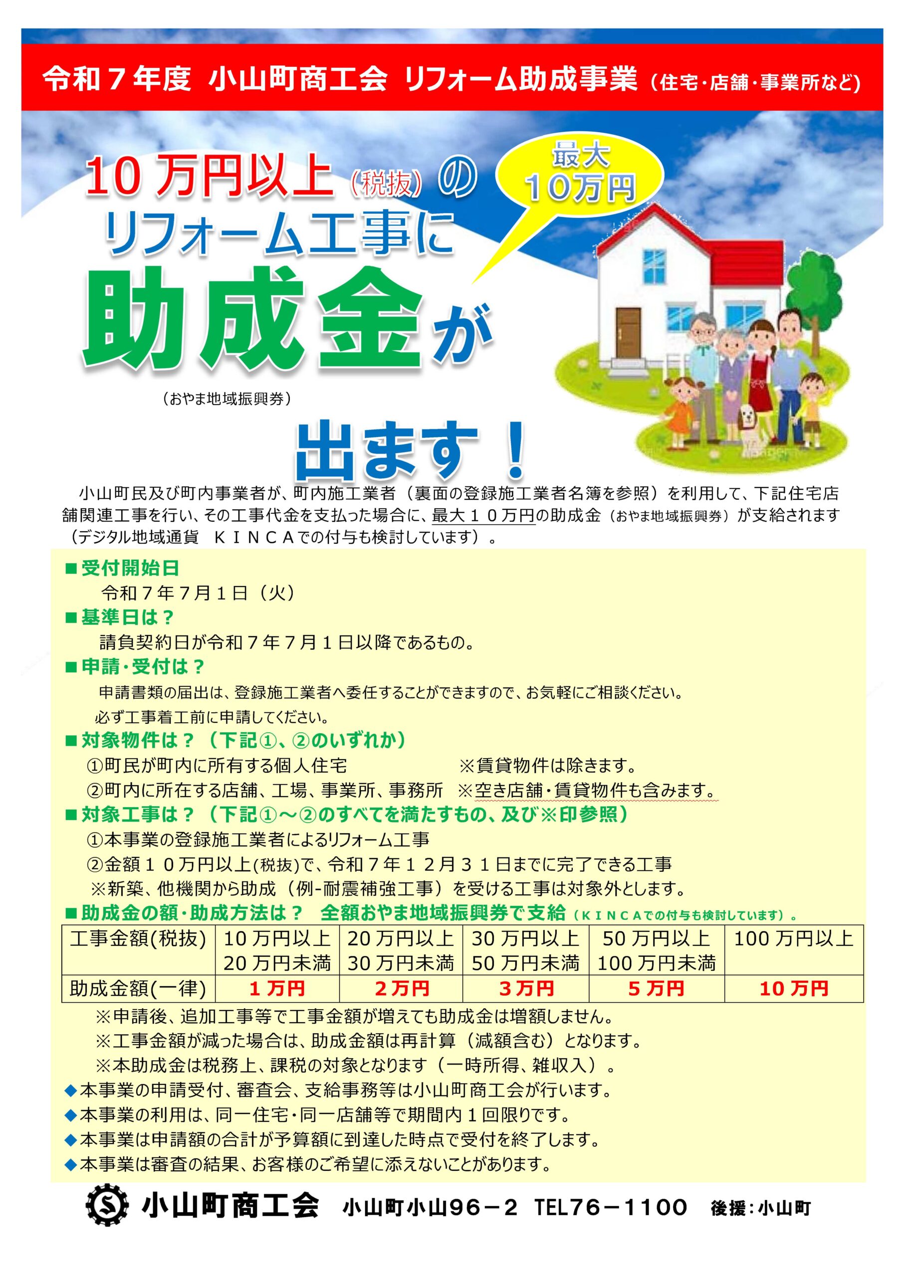 2025年6月3日 お知らせからのお知らせ 【ご案内】令和7年度 リフォーム助成事業のご案内 ◆令和7年度 リフォーム助成金事業(チラシ) 令和7年度リフォーム助成事業チラシ(事業詳細) 令和7年度リフォーム助成事業チラシ(事業者一覧:R7.6.5) ◆登録事業者の皆様へ R7様式集(様式1号~様式2号)はこちらから【Word版】