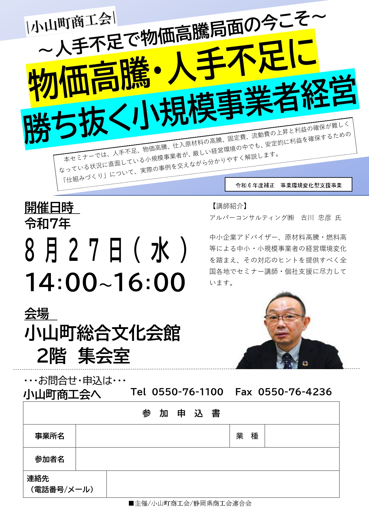 2025年7月23日 お知らせからのお知らせ 【ご案内】「~人手不足で物価高騰局面の今こそ~物価高騰・人手不足に勝ち抜く小規模事業者経営」講習会開催 本セミナーでは人手不足、物価高騰、仕入れ原材料の高騰、固定費、流動費の上昇と利益の確保が難しくなっている状況に直面している小規模事業者が、厳しい経営環境の中でも、安定的に利益を確保をするための「仕組みづくり」について、実際の事例を交えながら分かりやすく解説します。 詳細につきましては添付のチラシをご覧ください。 講 師 アルパーコンサルティング㈱ 古川 忠彦氏 開催日時 令和7円8月27日(水) 14時~16時 会 場 小山町総合文化会館2階 集会室