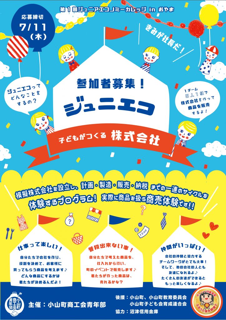 青年部では、新規事業として「ジュニアエコノミーカレッジinおやま」を初開催します。その参加者を募集します。